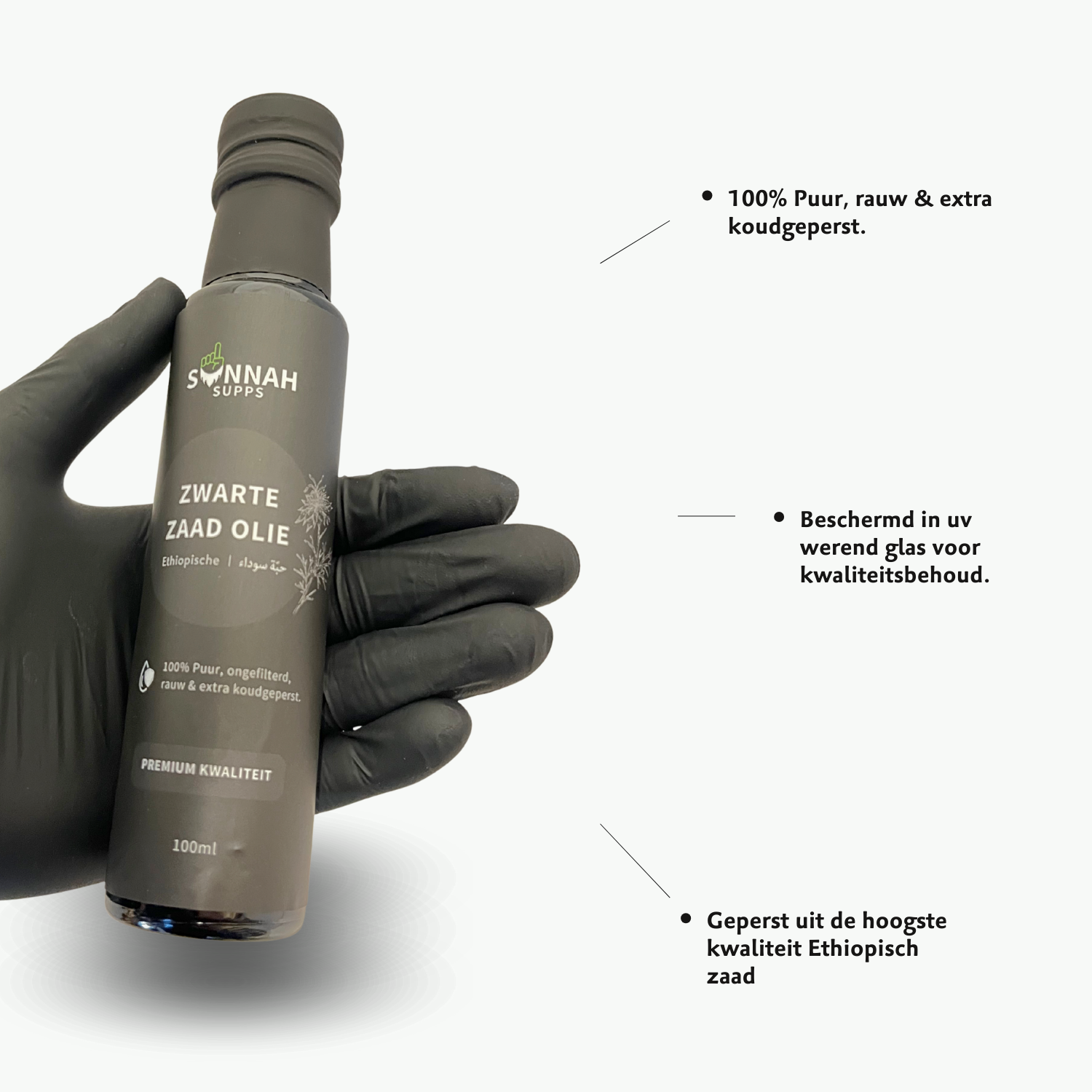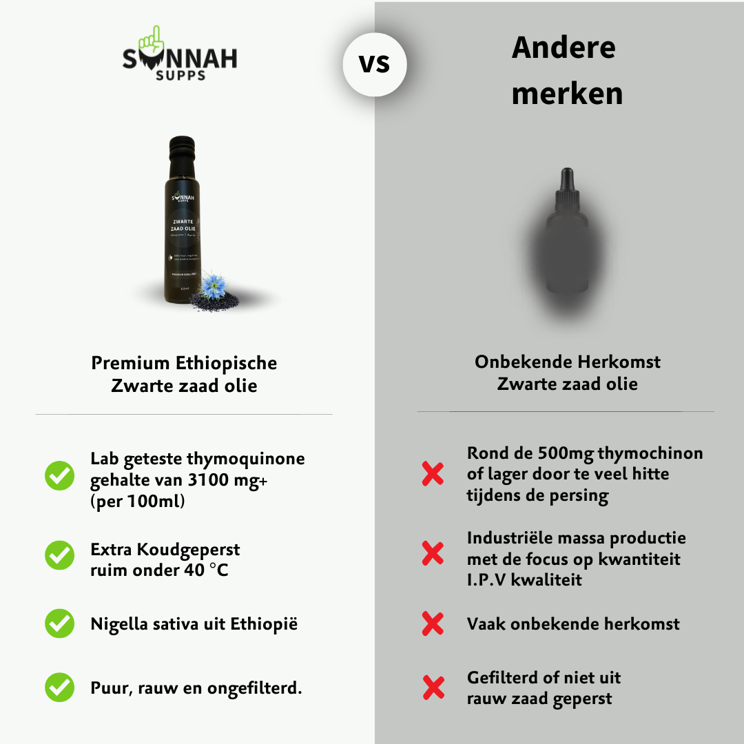 Bij SunnahSupps gebruiken we uitsluitend Rauwe Ethiopische Nigella sativa-zaden. Deze staan bekend als de krachtigste zwarte zaden ter wereld. De olie wordt vervolgens extra koudgeperst op 29–32°C voor een zo puur mogelijke kwaliteit en optimale werking.